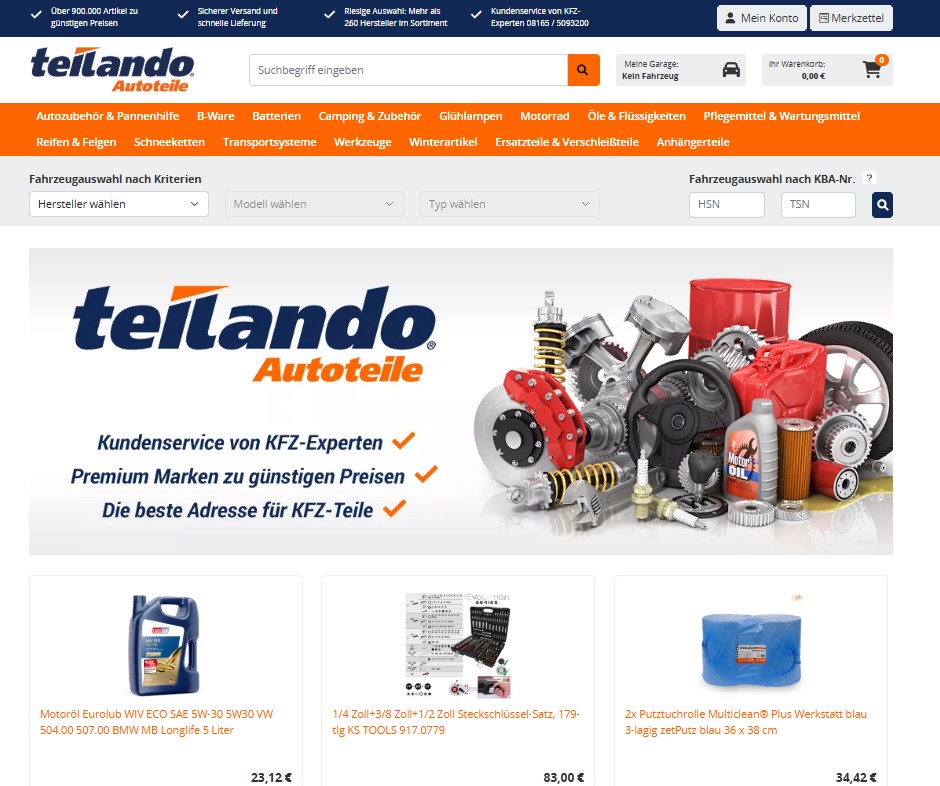 Teilando ist die Online-Plattform der Erwin Weber GmbH, die sich auf den digitalen Handel mit Kfz-Ersatzteilen spezialisiert hat. Das Angebot richtet sich an Werkstätten, Fachhändler sowie private Endkunden und bietet ein breites Sortiment an Ersatzteilen für unterschiedliche Fahrzeugtypen.